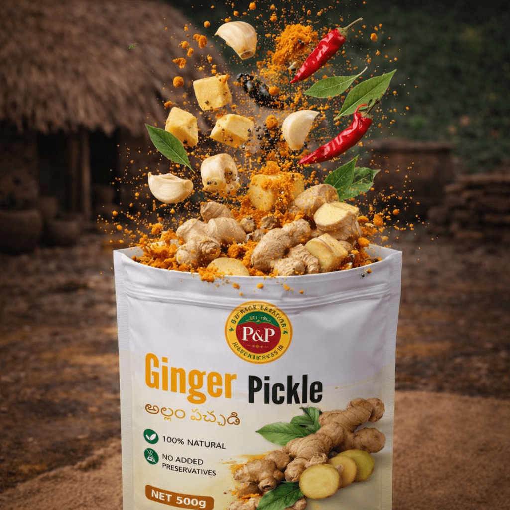 Our Ginger Pickle is a traditional South-Indian delicacy prepared using time-honoured Telangana recipes and slow-cooked in small batches. Fresh, tender ginger is carefully cleaned, chopped, and blended with tangy tamarind, natural jaggery, and aromatic spices to create a perfectly balanced pickle that is spicy, tangy, and mildly sweet.