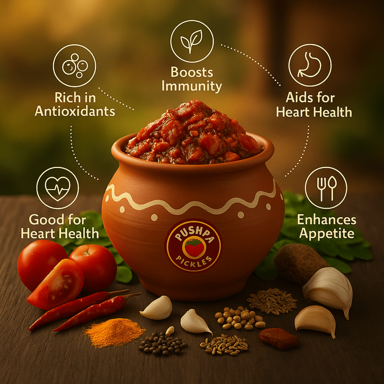 Our Tomato Pickle is a traditional South Indian delicacy prepared using fresh, ripe tomatoes and slow-cooked to perfection using time-honoured homemade methods. Carefully blended with aromatic spices, cold-pressed oil, and natural seasonings, this pickle delivers a bold balance of tanginess and spice in every bite.
